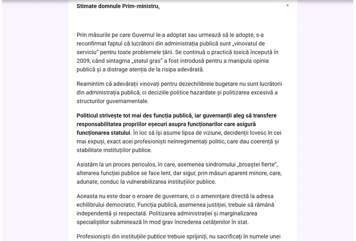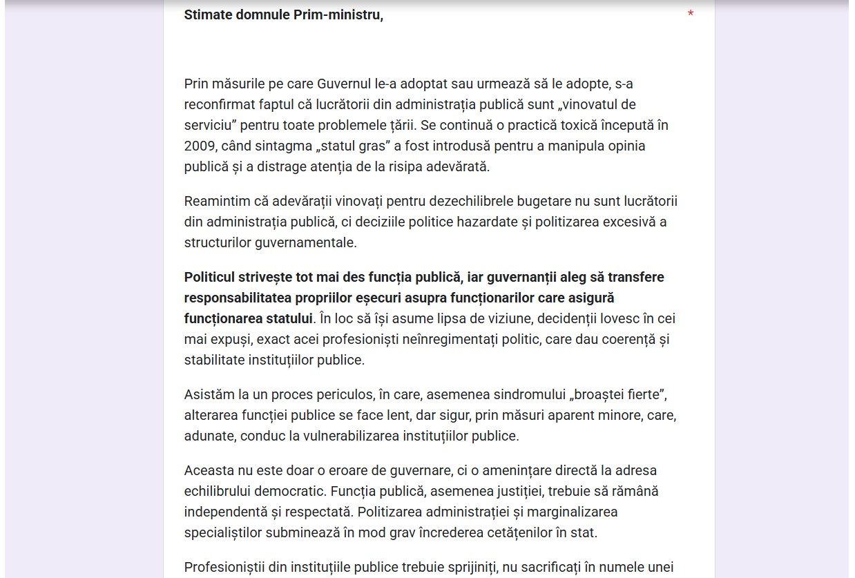 Vă solicităm, așadar, suspendarea implementării acestor măsuri până la realizarea unei analize detaliate a impactului lor și inițierea unui dialog autentic cu reprezentanții angajaților din sectorul public. Fără acest gest minim de onestitate instituțională, orice apel la solidaritate bugetară rămâne doar o lozincă lipsită de conținut.