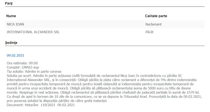 Pe data de 9 februarie 2021, Tribunalul Arad – Secția a III-a Contencios administrativ și fiscal, litigii de muncă și asigurări sociale – a decis că International Alexander SRL este ”bună de plată”, fiind obligată să îi plătească lui Ioan N. diferența de 5% dintre indemnizaţia primită pentru incapacitate temporară de muncă pentru boală obişnuită şi indemnizaţia pentru incapacitate temporară de muncă în urma unui accident de muncă, dar și suma de 5.000 euro, cu titlu de daune morale.