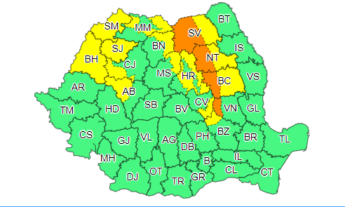 În intervalul 23 noiembrie ora 22:00 – 24 noiembrie, ora 10:00, ]n Carpații Orientali (zona de munte a județelor Suceava, Neamț, Bacău și Vrancea), în general la peste 1500 m, vântul va avea intensificări susținute cu rafale de 110…130 km/h, va fi viscol, iar vizibilitatea va fi redusă sub 50 m.