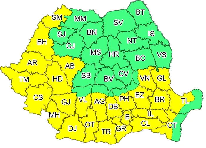 Patru noi județe intră sub avertizarea meteo, față de prognoza precedentă: Vrancea, Galați, Tulcea și Constanța.