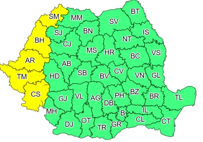 În Crișana, Banat și Maramureș, vor fi perioade cu intensificări ale vântului și vijelii, vitezele la rafală fiind de 55…60 km/h și izolat de peste 70 km/h. Local vor fi și averse, descărcări electrice și grindină, iar în intervale scurte de timp se vor acumula cantități de apă de 15…20 l/mp și izolat de peste 25 l/mp.