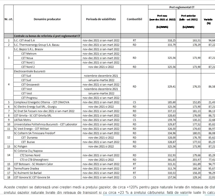 „Aceste creşteri se datorează unei creşteri medii a preţului gazelor, de circa +120% pentru gaze naturale livrate din reţeaua de distribuţie, de +140% a preţului gazelor naturale livrate din reţeaua de transport şi cu circa +23% a preţului cărbunelui, faţă de valorile luate în calcul pentru bonusul şi preţurile energiei termice valabile până la 31 octombrie 2021”, explică ANRE.