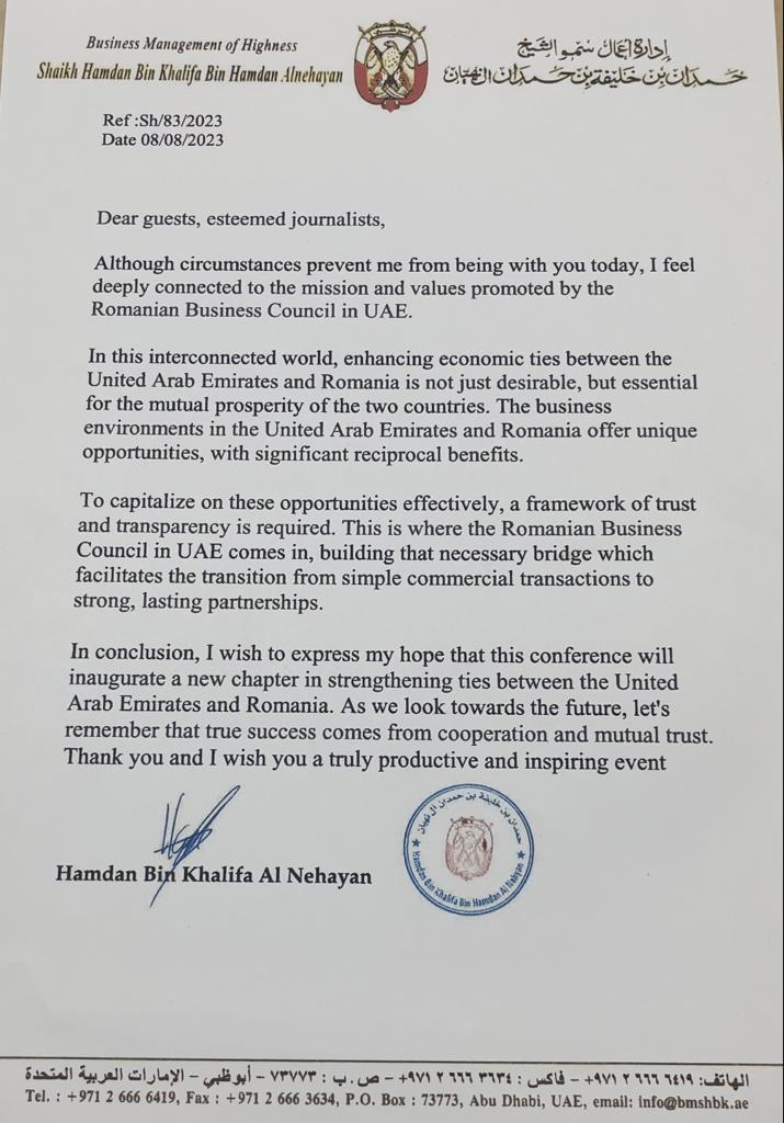 În această lume interconectată, consolidarea legăturilor economice dintre Emiratele Arabe Unite și România nu este doar de dorit, ci și esențială pentru prosperitatea reciprocă a celor două țări. Mediile de afaceri din Emiratele Arabe Unite și România oferă oportunități unice, cu beneficii reciproce semnificative, a transmis șeicul Hamdan Bin Khalifa Al-Nehayan.