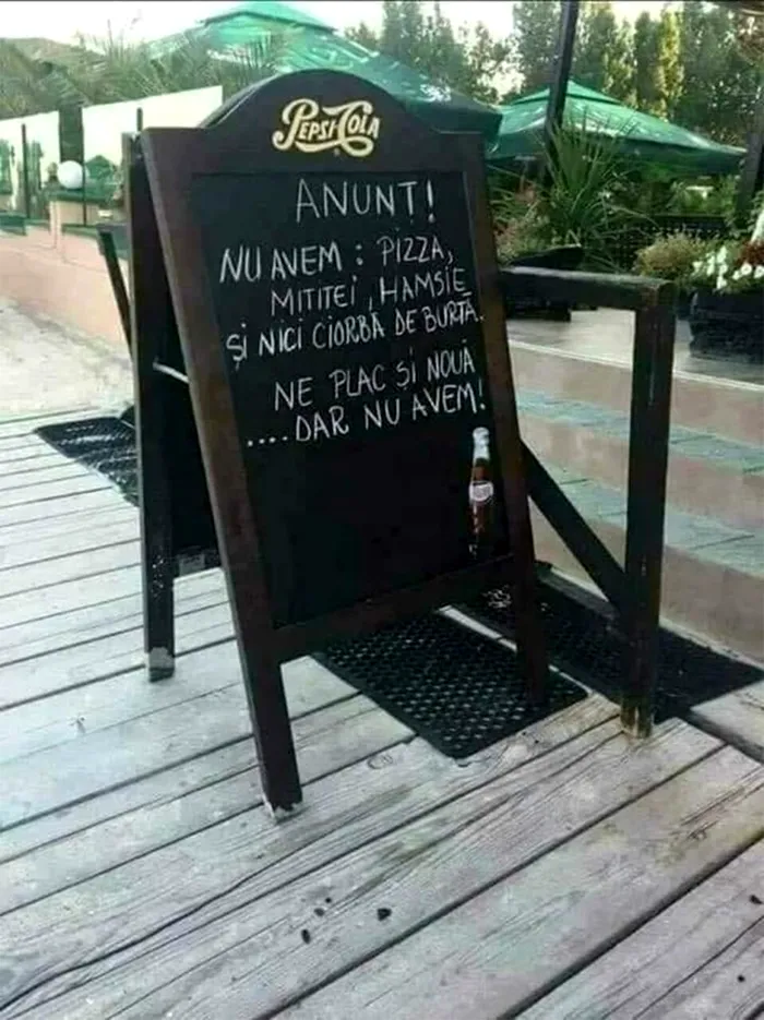 Un patron de terasă din Bacău a ales o metodă inedită de a le spune clienților că în localul respectiv nu se servesc mici, hamsii sau ciorbă de burtă. Exasperat, cel mai probabil, de cererile clienților, a ales să pună la intrarea pe terasă o tablă pe care a scris: ”Nu avem: pizza, mititei, hamsie și nici ciorbă de burtă. Și nouă ne plac, dar nu avem”.