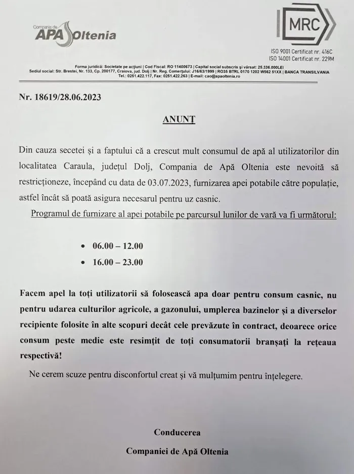A început programul de apă cu porția în Dolj. Localitatea Caraula este prima pe lista unde oamenii primesc apa cu porția din cauza faptului că a crescut consumul pentru grădini, gazon, și nu pentru uz personal.