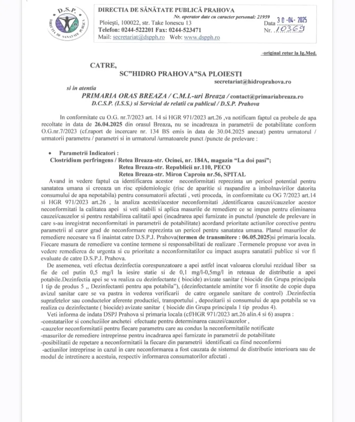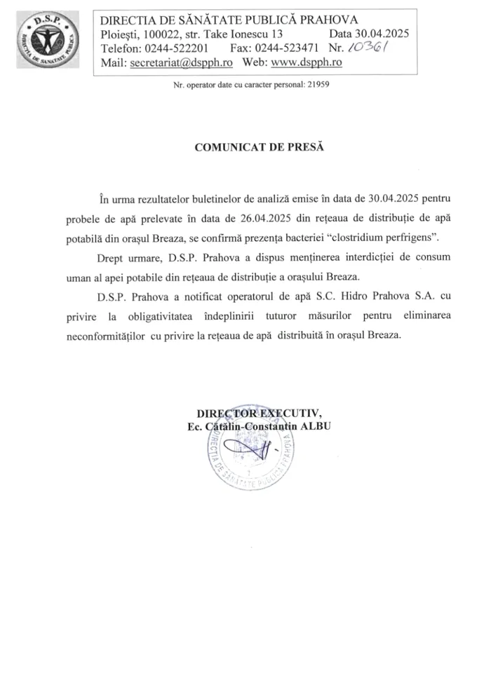 „În urmă cu scurt timp Direcția de Sănătate Publică Prahova a remis un comunicat de presă prin care se comunică faptul că în urma rezultatelor buletinelor de analiză emise în data de 30.04.2025 pentru probele de apă prelevate în data de 26.04.2025 din rețeaua de distribuție de apă potabilă din orașul Breaza, se confirmă prezența bacteriei „clostridium perfrigens”(n.r. Clostridium perfringens este o bacterie Gram-pozitivă sub formă de bacil, anaerobă, sporulată, patogenă, aparținând genului Clostridium, cunoscută în trecut ca C. welchii sau Bacillus welchii).