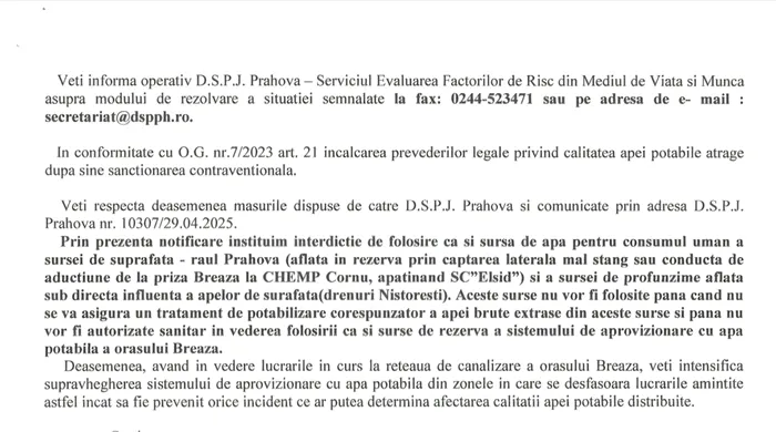 A fost dispusă interdicția de consum uman a apei furnizate de Hidro Prahova în orașul Breaza până la comunicarea buletinelor de analiză.Au fost recoltate probe de apă care au fost transmise către laborator în vederea testării calității acesteia.