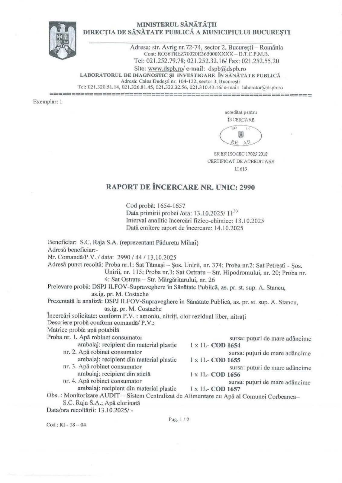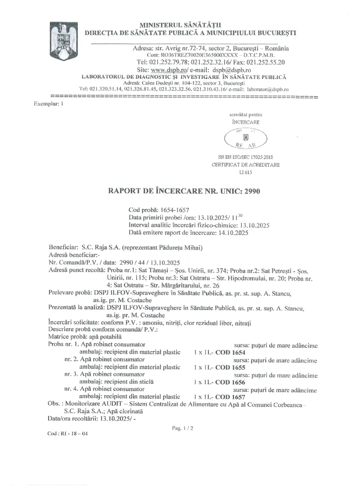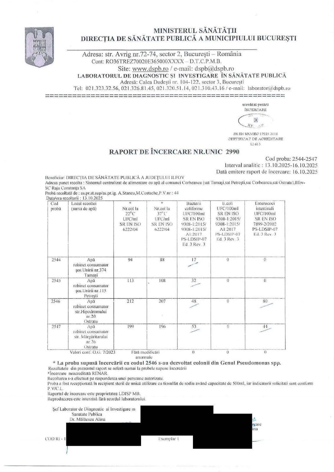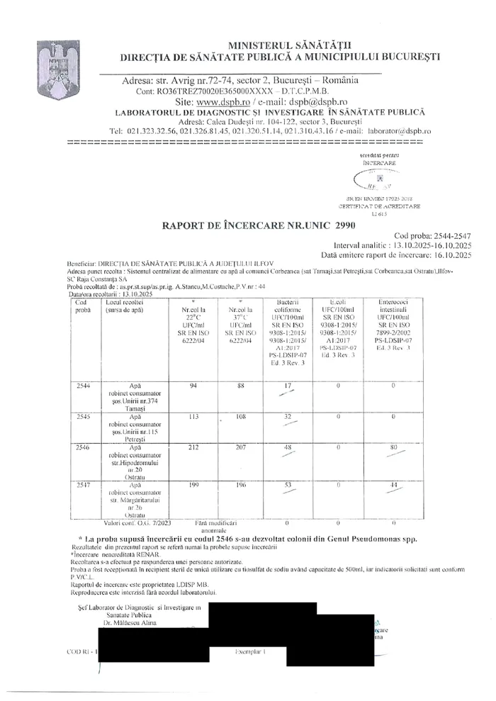 Raportul de încercare nr. 2990, emis de Laboratorul DSP București, detaliază analizele chimice și bacteriologice efectuate între 13 și 16 octombrie 2025. Rezultatele arată depășiri ale limitelor legale și prezența microorganismelor periculoase pentru sănătatea umană.