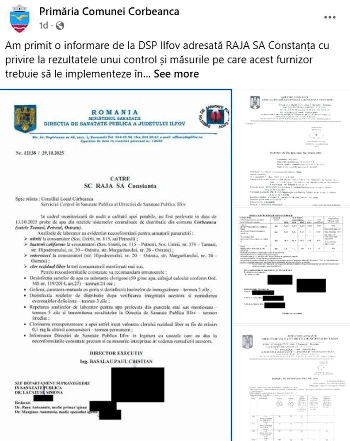 În cadrul monitorizării de audit a calității apei potabile, Direcția de Sănătate Publică Ilfov a prelevat probe din sistemul centralizat de distribuție al comunei Corbeanca, administrat de SC RAJA SA Constanța. Rezultatele, consemnate în Adresa DSP nr. 12138 / 29.10.2025, sunt alarmante: