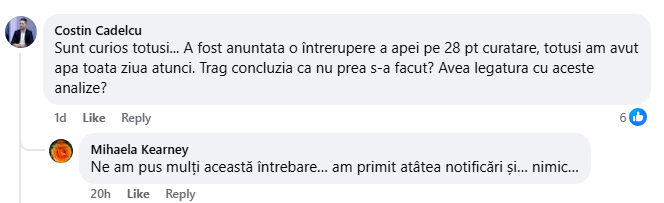 „Sunt curios totuși… A fost anunțată o întrerupere a apei pe 28 pt. curățare, totuși am avut apă toată ziua atunci. Trag concluzia că nu prea s-a făcut? Avea legatură cu aceste analize?