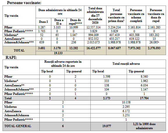 În ultimele 24 de ore au fost raportate 6 reacții adverse, numărul total al reacțiilor înregistrate de la începutul campaniei de vaccinare a ajuns astfel la 19.877. CNCAV precizează că 130 de reacții adverse sunt în curs de investigare.