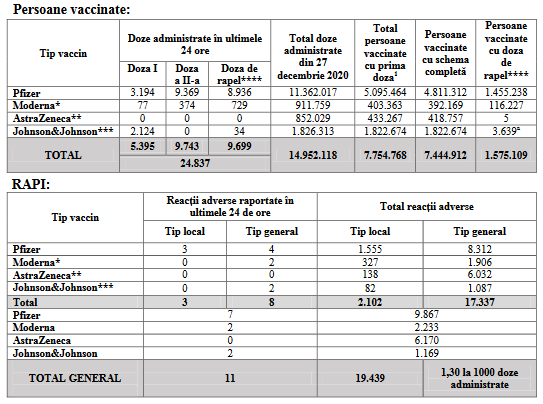 În total, România are 7.754.768 de persoane vaccinate, din care 7.444.912 cu schema completă și 1.575.109 inclusiv cu a treia doză.