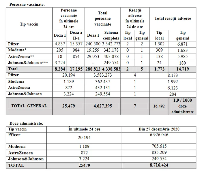 În total, de la începutul campaniei, 4.627.395 de români au fost vaccinați, din care 4.338.583 cu schema completă.