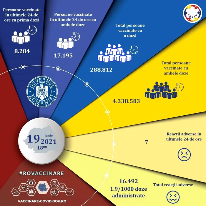 Comitetul Național de Coordonare a Activităților privind Vaccinarea împotriva COVID-19 (CNCAV) a anunțat sâmbătă, 19 iunie, că 25.479 de persoane au fost vaccinate în ultimele 24 de ore.