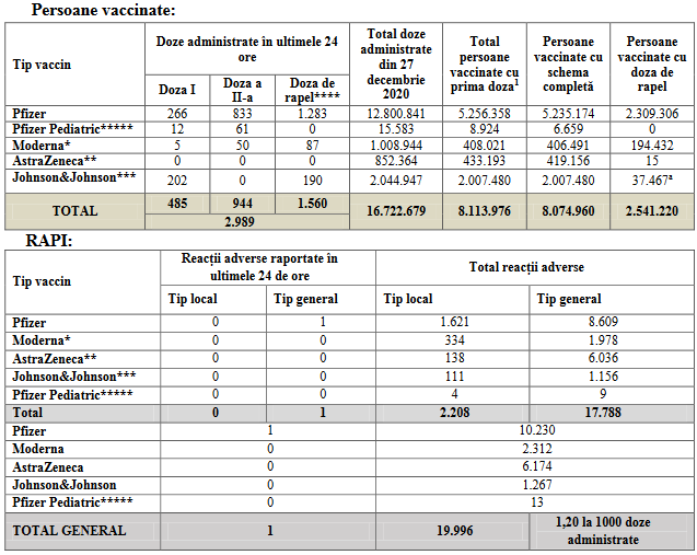 În ultimele 24 de ore a fost înregistrată o singură reacţie adversă de tip general. În total, de la debutul campaniei de vaccinare s-au înregistrat 19.996 de reacţii adverse la vaccinurile anti-COVID, 2.208 de tip local şi 17.788 de tip general.