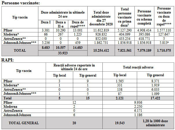 În ultimele 24 de ore au fost înregistrate 20 de reacții advese, iar de la începutul campaniei de vaccinate au fost raportate 19.543 de reacții adverse. CNCAV precizează că 223 reacții adverse sunt în curs de investigare.