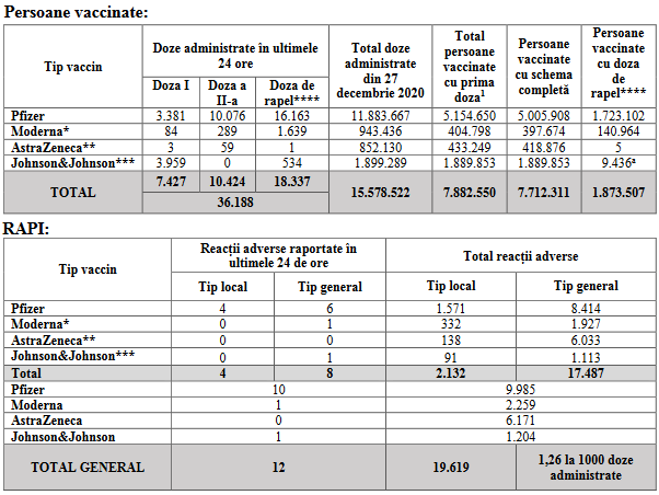 Numărul persoanelor vaccinate cu prima doza de la începutul campaniei este 7.882.550, cu două doze 7.712.311, iar cu doza a treia 1.873.507 persoane.