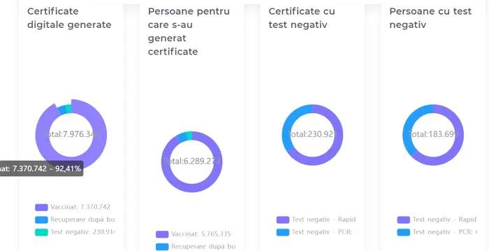 Numărul certificatelor digitale verzi COVID-19 descărcate de români se apropie de pragul de 8 milioane, mai exact 7.940.274. Dintre acestea, peste 92,45% sunt certificate care atestă vaccinarea, iar restul testarea sau trecerea prin boală.