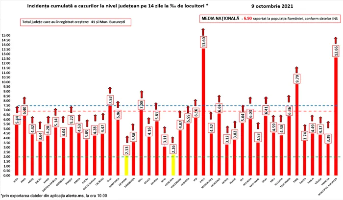 Incidența națională a ajuns la 6,90 ‰. Potrivit datelor GCS, doar două județe au mai rămas în scenariul galben – Covasna și Harghita. În rest, toate județele țării sunt în scenariul roșu.