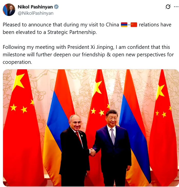 „Am plăcerea să anunț că, în timpul vizitei mele în China, relațiile (n.red. – dintre China și Armenia) au fost ridicate la nivelul unui Parteneriat Strategic. În urma întâlnirii mele cu președintele Xi Jinping, sunt încrezător că această etapă importantă va adânci și mai mult prietenia noastră și va deschide noi perspective de cooperare”, a scris Pashinyan.