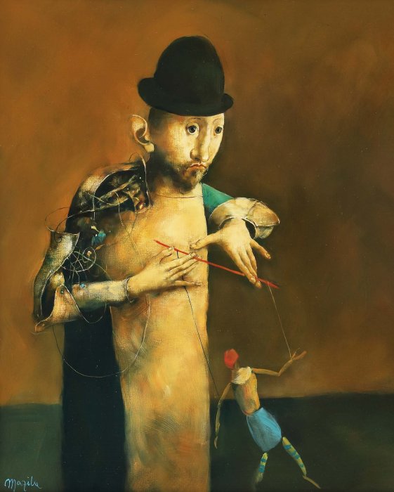 Un alt tablou semnat de Georges Mazilu, ”Le marionnettiste”acrilic pe pânză 46 x 38 cm semnat stânga jos, cu albastru, ”Mazilu” – a fost adjudecat pentru 7.250 de euro.