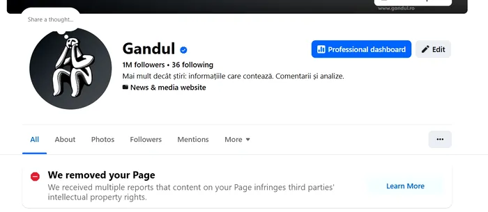 Compania Meta, care operează platforma Facebook, a închis pagina ziarului Gândul pe 22 februarie 2026, fără niciun avertisment sau explicație clară. Într-o zi, pagina a dispărut și s-a prăbușit traficul Gândul, prejudiciul imediat fiind de 6-7 milioane de vizualizări zilnic și aproape 200 de milioane de vizualizări pe lună pe Facebook și pe site.