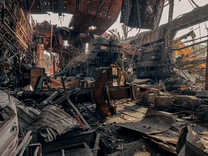 Între ele, se numără și cele în care apar doi soldați ce sunt înconjurați de metalul distrus al combinatului Azovstal.