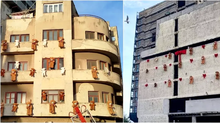 Cetățenii din Constanța au fost  scandalizați după ce un bloc, a fost decorat pentru Târgul de Crăciun, cu o mulțime de ursuleți din pluș, atârnați de fațada veche a clădirii, o imagine mai degrabă sumbră decât festivă.