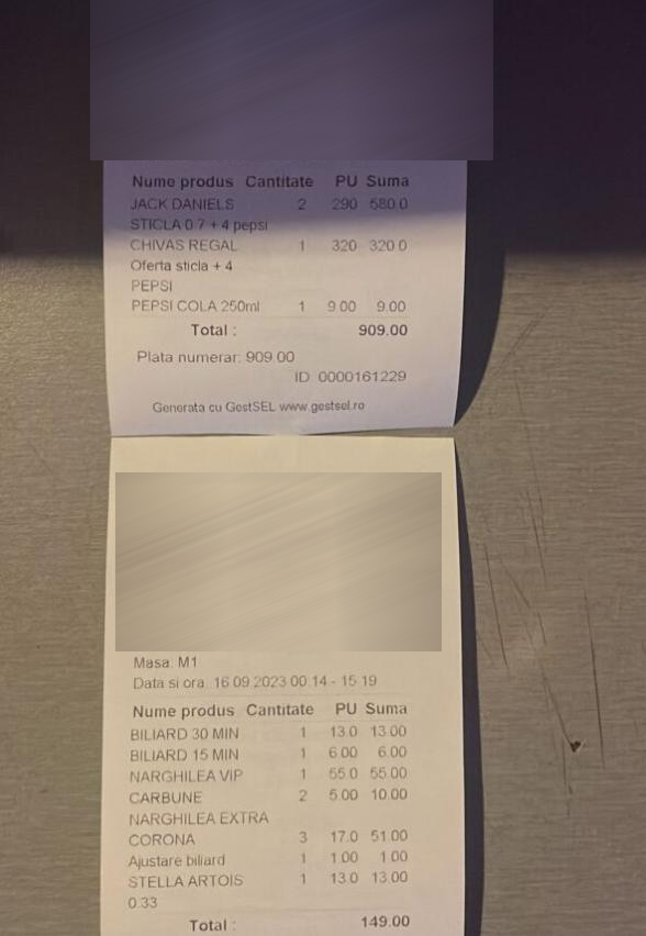 Două sticle de Jack Daniels, una de Chivas Regal, 45 minute de biliard, Narghilea VIP, bere și sucuri, de toate aceste produse s-au bucurat mesenii, iar dovada se regăsește în două bonuri neachitate. „Dauna totală”: 1.058 de lei.