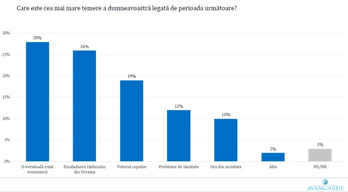 În ceea ce privește temerile românilor, principala rămâne o eventuală criză economică(28%), urmată de escaladarea războiului din Ucraina (26%), de viitorul copiilor (19%), de probleme de sănătate (12%) și de ura din societate (10%).