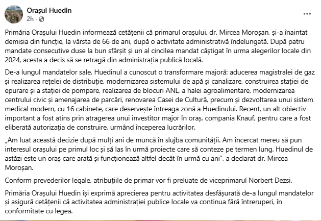 Primăria orașului Huedin, din județul Cluj, a anunțat prin intermediul unei postări pe rețelele de socializare, că primarul Mircea Moroșan și-a înaintat demisia din funcție. Decizia lui Moroșan vine după patru mandate consecutive duse la bun sfârșit și un al cincelea mandat câștigat în urma alegerilor locale din 2024.