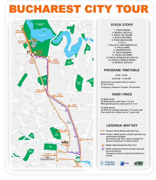 Linia turistică „Bucharest City Tour” funcționează zilnic de la Casa Presei până la Piața Unirii.