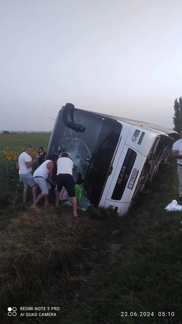 Autocar înmatriculat în BULGARIA, răsturnat pe DN2, în Vrancea/Opt persoane au suferit răni ușoare, una a fost dusă la spital
