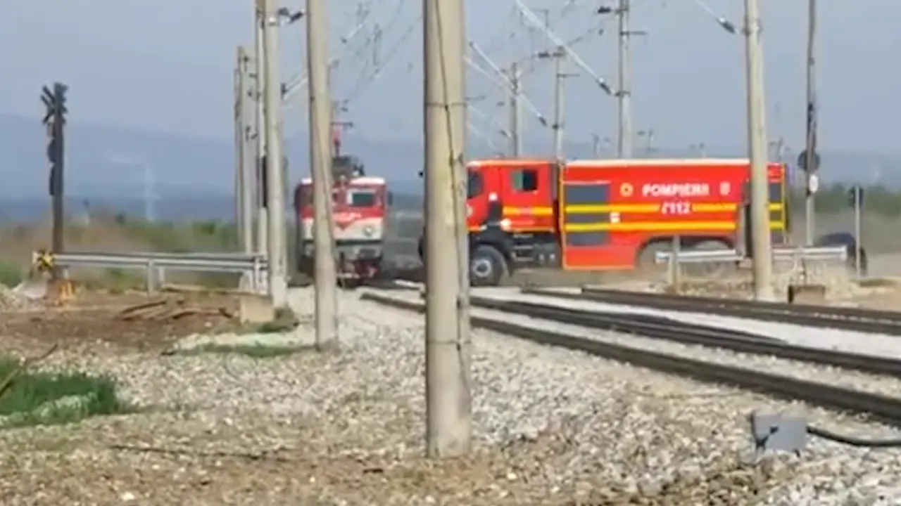 Conform unui videoclip postat pe social media, maşina de pompieri trece razant prin faţa unui tren. Mecanicul garniturii frânează brusc și reușește, în ultimul moment, să evite o tragedie.
