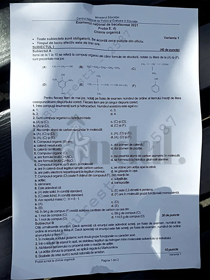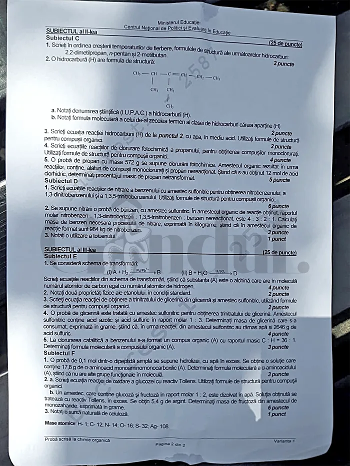 La chimie organică absolvenții de liceu au primit 3 subiecte. Primul este notat cu 40 de puncte, iar ultimele două cu câte 25 de puncte. Alte 10 puncte se acordă din oficiu.