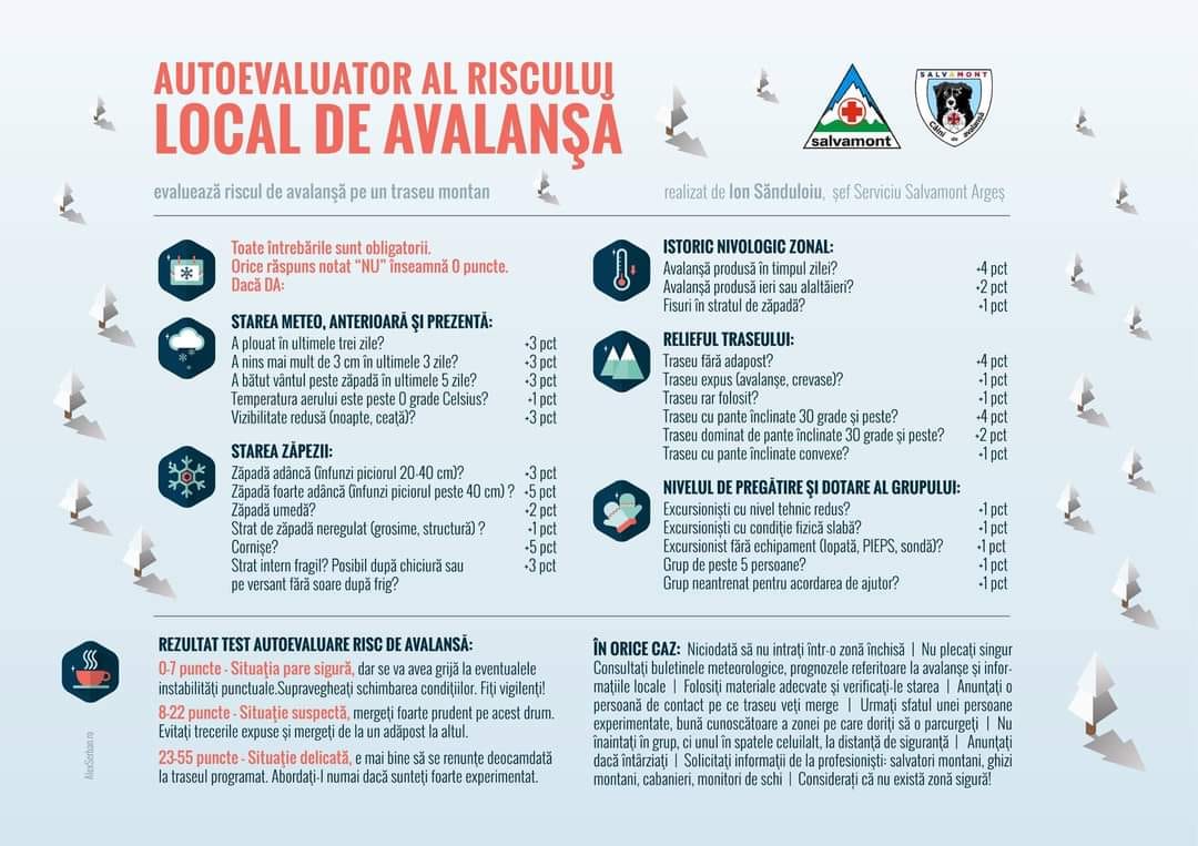 A apărut riscul de avalanșă la peste 1800 de metri altitudine. Salvamont pune la dispozițe excursioniștilor un autoevaluator cu ajutorul căruia orice amator de drumeții pe timp de iarnă poate estima riscurile. Nu este nevoie să fi un temerar experimentat, trebuie doar să bifezi un chestionar și veți putea lua o decizie de bun simț dacă veți continua să alegeți un traseu sau.