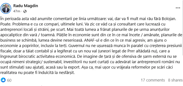 „În perioada asta văd anumite comentarii pe linia următoare: vai, dar va fi mult mai rău fără Bolojan. Poate. Problema e cu ce compari, ultimele luni. Va zic ce văd ca și consultant care lucrează cu antreprenori locali și străini, pe scurt. Mai toată lumea a frânat planurile de pe urma anunțurilor apocaliptice din vară / toamnă. Plățile în economie sunt din ce în ce mai încete / amânate, planurile de business se schimbă, lumea devine neserioasă. ANAF-ul e din ce în ce mai agresiv, am ajuns o economie a popririlor, inclusiv la terți”.