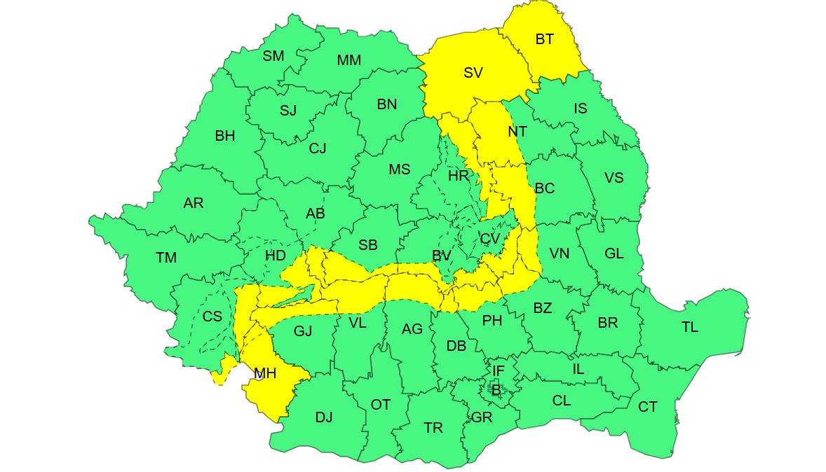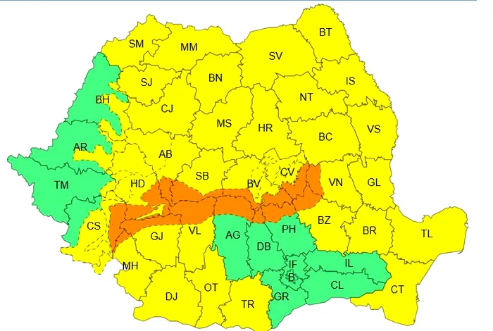 Codul portocaliu de vânt puternic și viscol va fi valabil în intervalul 28 decembrie, ora 02:00 – 29 decembrie, ora 10:00. Fenomene și zone vizate: intensificări puternice ale vântului, viscol și vizibilitate foarte redusă în zona înaltă a Carpaților Meridionali și de Curbură