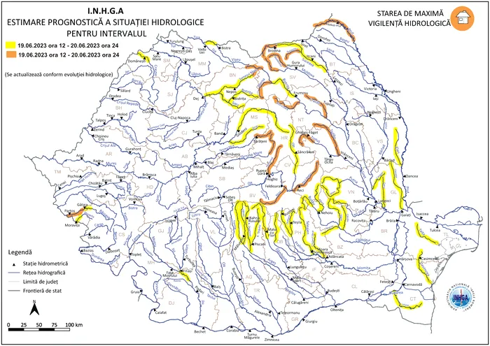 Astfel, potrivit INHGA, în intervalul 19.06.2023 ora 12:00 – 20.06.2023 ora 24:00 pe râurile din bazinele hidrografice: Tisa – pe sectorul aferent S.H. Valea Vişeului (intrarea în ţară), Someşul Mare (judeţul Bistriţa Năsăud), Crasna – curs inferior (judeţul Satu Mare), Mureş – bazin amonte S.H. Glodeni, Niraj (judeţele: Harghita şi Mureş), Târnava Mică – bazin superior şi afluenţi bazin mijlociu şi inferior (judeţele: Harghita, Mureş şi Alba), Târnava Mare – bazin superior şi afluenţi bazin mijlociu şi inferior (judeţele: Harghita, Mureş, Alba, Braşov şi Sibiu), Bârzava – sector aval confluenţă cu râul Fizeş, Moraviţa – curs inferior (judeţele: Caraş Severin şi Timiş), Jiu – pe sectorul aferent S.H. Răcari (judeţul Dolj), Olt – bazin amonte S.H. Micfalău şi afluenţii aferenţi sectorului aval S.H. Micfalău – amonte confluenţă cu râul Şercaia (judeţele: Harghita, Covasna, şi Braşov), Argeş – bazin superior (judeţul Argeş), Dâmboviţa – bazin superior (judeţele: Argeş şi Dâmboviţa), Ialomiţa – bazin amonte Ac. Pucioasa (judeţele: Dâmbovita şi Prahova), Prahova – bazin superior şi afluenţi bazin mijlociu şi inferior (judeţul Prahova), Buzău – bazin amonte Ac. Siriu şi afluenţii aferenţi sectorului aval Ac. Siriu – amonte S.H. Baniţa (judeţele: Braşov, Covasna, Buzău şi Prahova), Suceava (judeţul Suceava), Moldova – bazin superior şi afluenţi bazin mijlociu şi inferior (judeţele: Suceava şi Neamţ), Bistriţa – bazin amonte S.H. Frumosu şi afluenţii aferenţi sectorului aval S.H. Frumosu (judeţele: Suceava, Neamţ, Harghita şi Bacău), Trotuş – bazin superior şi afluenţi bazin mijlociu şi inferior (judeţele: Harghita, Bacău, Neamţ, Covasna şi Vrancea), Putna – bazin superior şi afluenţi bazin mijlociu şi inferior (judeţul Vrancea), Rm. Sărat – bazin superior şi afluenţi bazin mijlociu şi inferior (judeţele: Buzău şi Vrancea), Siret – afluenţii mici de stânga aferenţi sectorului aval S.H. Lungoci (judeţul Galaţi), Prut – pe sectorul amonte Ac. Stânca Costeşti (judeţul Botoşani), Prut – afluenţii aferenţi sectorului aval S.H. Drânceni (judeţele: Vaslui şi Galaţi) şi râurile din Dobrogea (judeţele: Constanţa şi Tulcea).