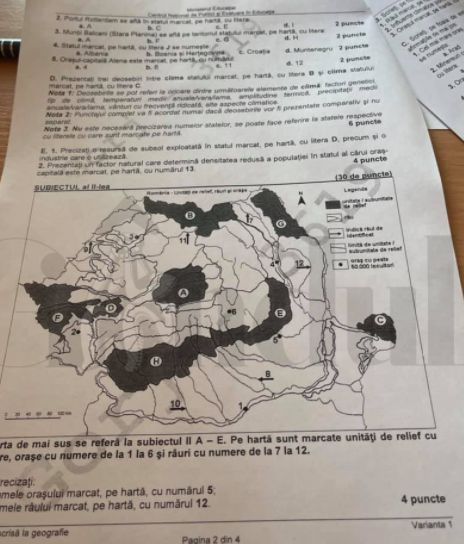 La SUBIECTUL al II-lea, cerințele sunt din Geografia României, majoritatea (punctele A – E) făcând apel la observarea, citirea şi interpretarea Hărţii României.