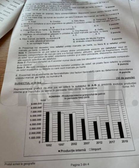 Primul subiect la BAC Geografie  2021 este notat cu 30 de puncte, la fel și subiectul al doilea și al treilea. Alte 10 puncte sunt acordate din oficiu.