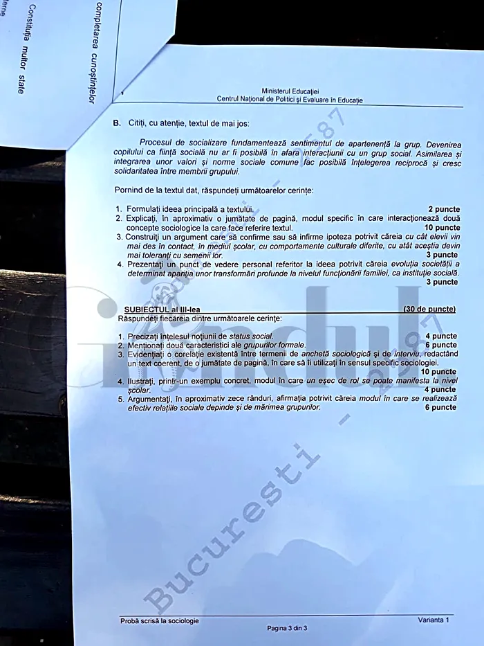 Examenul de Bac la sociologie este împărțit în trei subiecte, fiecare notat cu câte 30 de puncte. Pentru rezolvarea subiectelor, timpul alocat este de 3 ore.