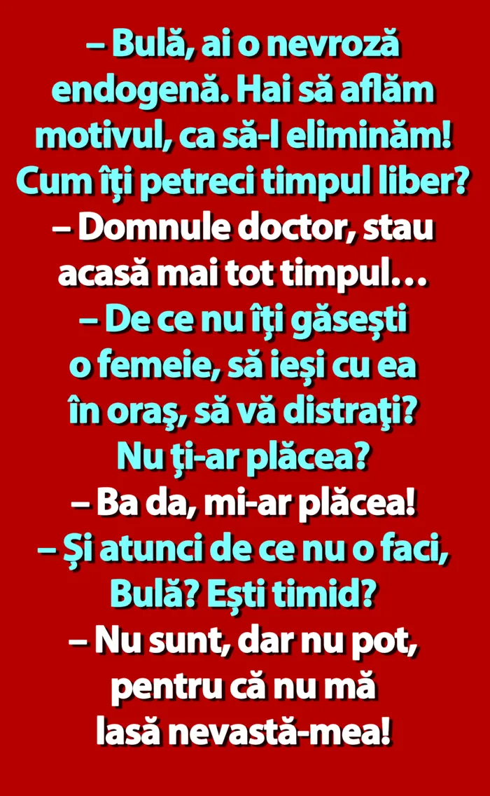 – Bulă, ai o nevroză endogenă. Hai să aflăm motivul, ca să-l eliminăm! Cum îți petreci timpul liber?