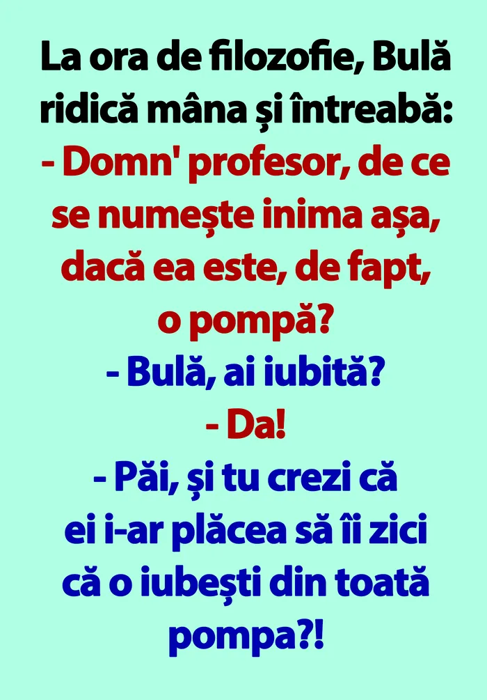 – Domn’ profesor, de ce se numește inima așa, dacă ea este, de fapt, o pompă?