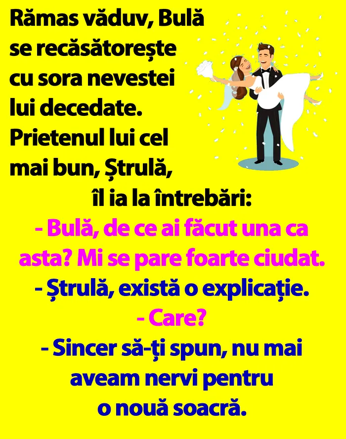 Rămas văduv, Bulă se recăsătorește cu sora nevestei lui decedate. Prietenul lui cel mai bun, Ștrulă, îl ia la întrebări:
