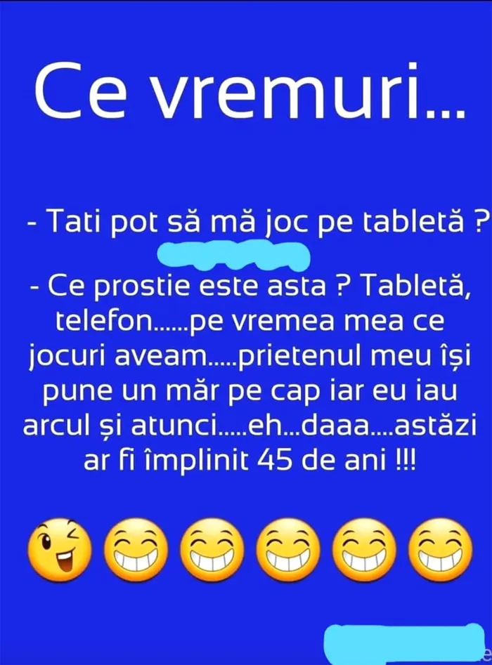 -Ce prostie este asta? Tabletă, telefon,.. pe vremea mea, ce jocuri aveam, prietenul meu își pune un măr pe cap iar eu iau arcul și atunci…daa…astăzi ar fi împlinit 45 de ani!