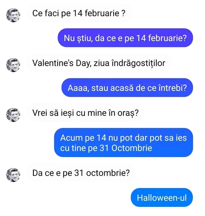 -Acum pe 14 nu pot, dar pot să ies cu tine pe 31 octombrie.