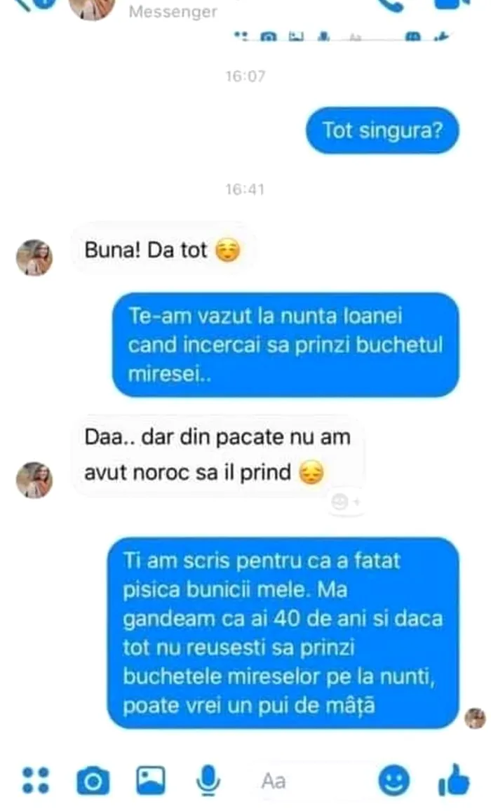 – Ți-am scris, de fapt, pentru că a fătat pisica bunicii mele. Mă gândeam c ai 40 de ani și… dacă tot nu reușești să prinzi buchetele mireselor pe la nunți… poate vrei un pui de mâță!