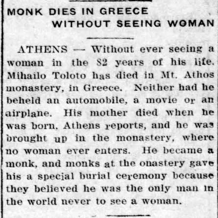 „Fără a vedea vreodată o femeie în cei 82 de ani de viață, Mihailo Toloto a murit la o mănăstire de pe Muntele Athos, din Grecia. El nu a văzut nicio mașină, niciun film sau un avion. Mama lui a murit la naștere, iar el a fost adus la o mănăstire unde nu intră niciodată vreo femeie. A devenit călugăr, iar călugării i-au organizat o ceremonie specială de înmormântare, pentru că se crede că este singurul bărbat din lume care nu a văzut niciodată o femei”, notează publicația.