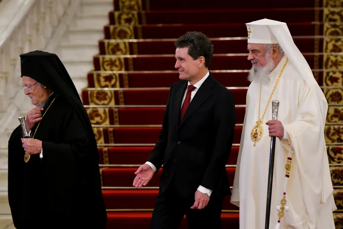 Sanctitatatea Sa Bartolomeu I (C), Patriarhul Ecumenic al Constantinopolului, si Preafericitul Parinte Daniel (D), Patriarhul Bisericii Ortodoxe Romane, au fost primiti de catre presedintele Romaniei, Nicusor Dan (S), la Palatul Cotroceni, luni, 27 octombrie 2025. ALEXANDRU DOBRE / MEDIAFAX FOTO
